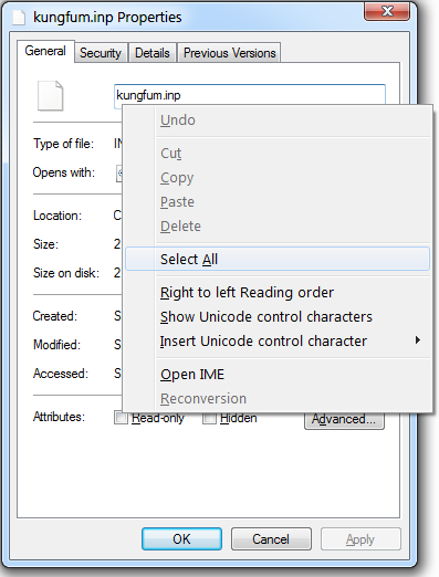 Interestingly on my Windows7 machine the properties dialog has a TextBox on the details tab as per the following screenshot: Then, when I right click on the TextBox at the top of the details tab, I get the Select All option that I was talking about. I wonder what option, or similar, I have turned on on my Windows 7 installation to make that dialog different?